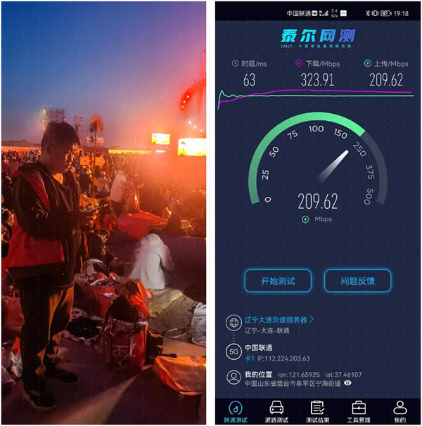 开展拉网测试,护航网络畅通。测试人员重复多次进行拉网工作,在多个点位测试发送抖音、微信朋友圈均未发生卡顿,用户感知良好。测试数据显示,在用户数量众多的情况下,网络下载和上传速率均表现正常,现场测试5G下行速率稳定在200Mbps以上,上行速率稳定在100Mbps以上,可供用户正常使用,微信、抖音等主流APP使用无卡顿。