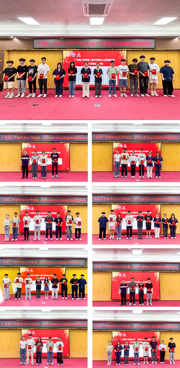广东理工学院电气与电子工程学院副院长罗泽鹏、电气与电子工程学院辅导员高国华老师、电气与电子工程学院辅导员胡涵老师,讯方技术校企班主任刘子骞老师,以及各赛道获奖的参赛选手,华为ICT学院学生代表出席颁奖典礼。