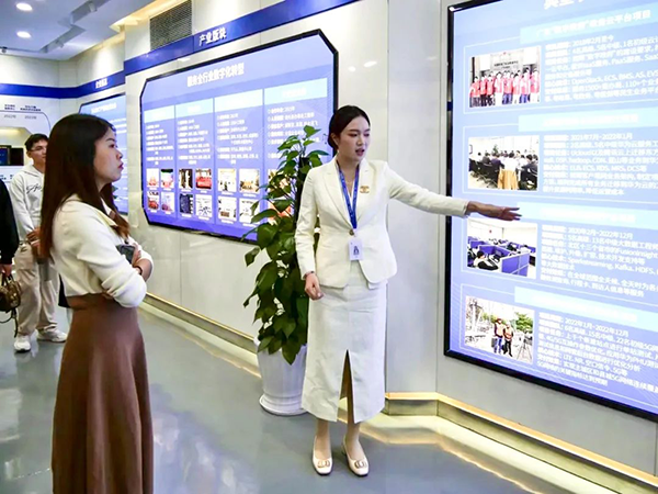 来访师生随后参观了讯方技术展厅,深入了解讯方技术发展历程、业务模块、经营理念等内容,并了解讯方技术人才培养“三循环”生态模式、深度参与高校课程改革、引入职业认证等举措。过程中,大家认真听取介绍,并积极提问,表现出浓厚的兴趣。在交流中,学生们不仅获得了宝贵的行业知识,还对讯方技术的创新精神和企业责任感有了更深刻的认识。