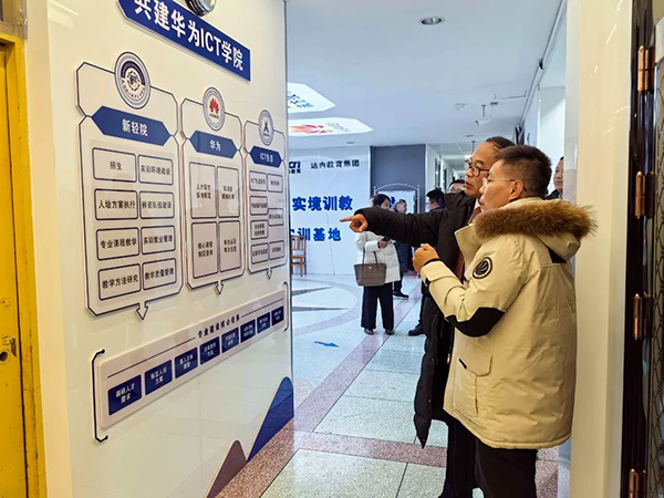 来访领导首先参观了华为ICT学院展厅及文化长廊,对新疆轻工职业技术学院与华为、讯方技术开展的校企合作共建华为ICT学院的运营模式、人才培养体系、专业建设、课程体系以及华为职业认证、实习就业等内容进行了深入了解。