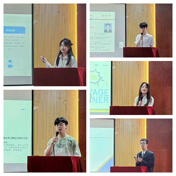 在第一届简历设计大赛决赛中,12名参赛选手依次登台,通过PPT展示个人简历,说明排版逻辑、设计思路,并分析简历内容与目标岗位的匹配性,展现出自身专业素养和创新思维。评委从内容准确性、设计规范性和表达清晰度等多个维度进行评分,最终评出各奖项并现场公布结果。