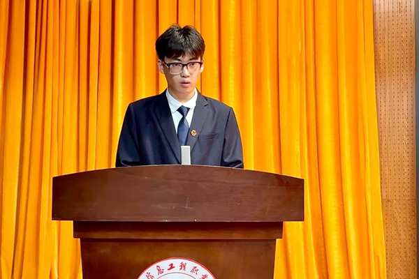 华为网络工程师班郭敬楷作为优秀学生代表发言,感谢校院领导老师的支持,并分享备赛及认证备考经验。他着重强调组建专业互补型学习小组对团队协作的重要性,同时通过个人备考故事展现高效复习策略,引发在场同学共鸣,为专业技能提升提供了可借鉴参考。