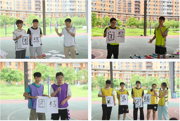 每名队员紧握笔周边的绳子,全神贯注地操控笔尖,于纸上共同勾勒“团结”二字。大家心无旁骛,默契配合,通过精准调控力度与方向,力求在限定时间内,让作品既工整又美观。随着时间缓缓流逝,各组作品渐次成型,展现出不同的风格。最后,每组邀请3名同学,上台对小组作品进行讲解,他们不仅分享了游戏中的心得与体会,还阐述了作品背后的深意,让在场的每一个人都感受到了团结的力量与美好。