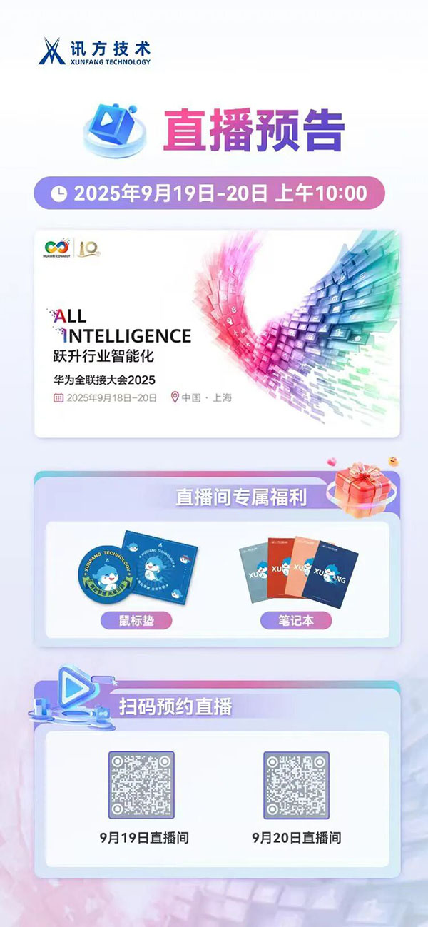 大会期间,讯方技术展台将同步开启线上直播,通过深度业务解读与实时互动,带您零距离体验讯方技术的硬核实力。立即点击预约直播间,锁定精彩内容,携手跃升智能时代。观看直播还可参与不定时抽奖,惊喜好礼等您来拿!