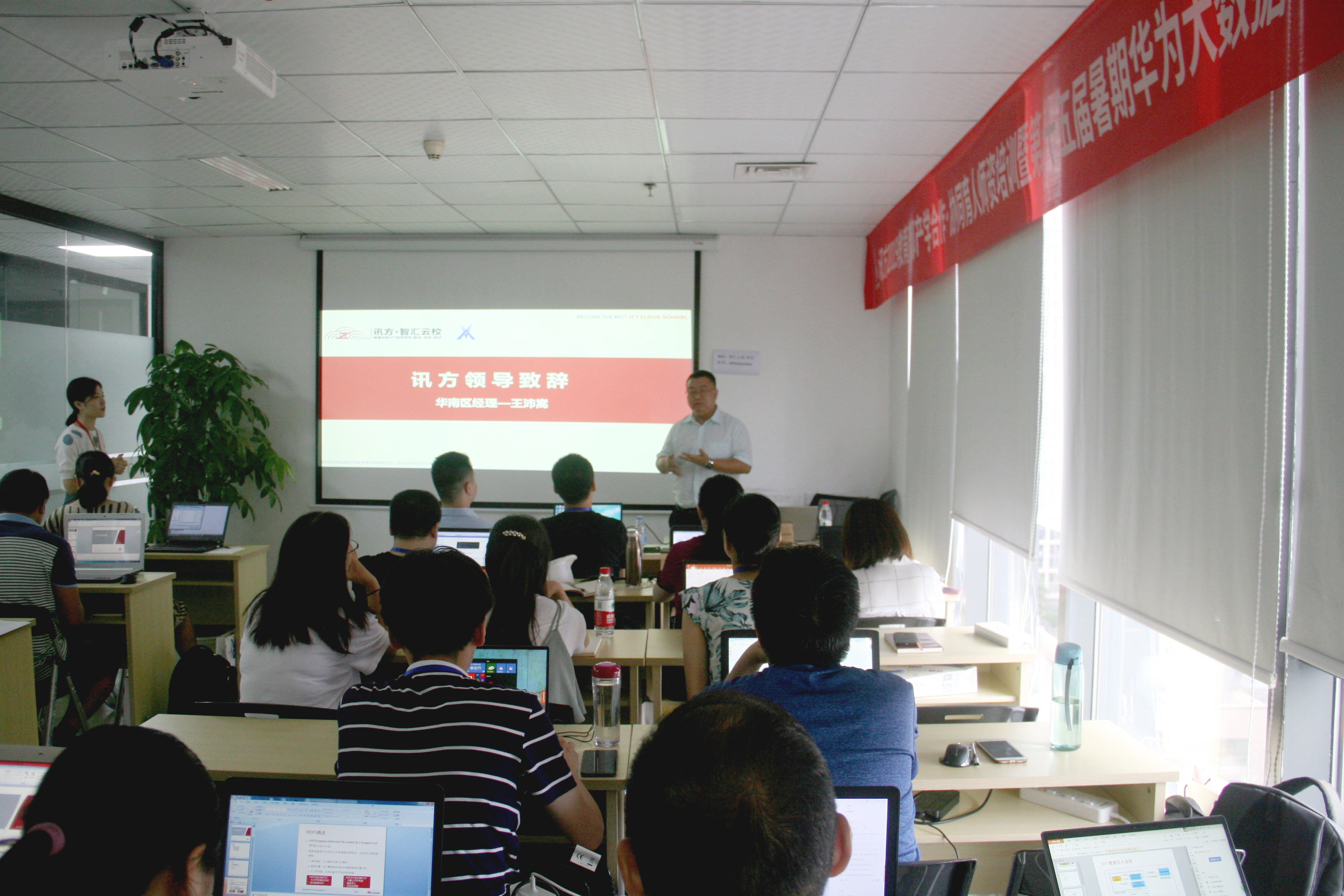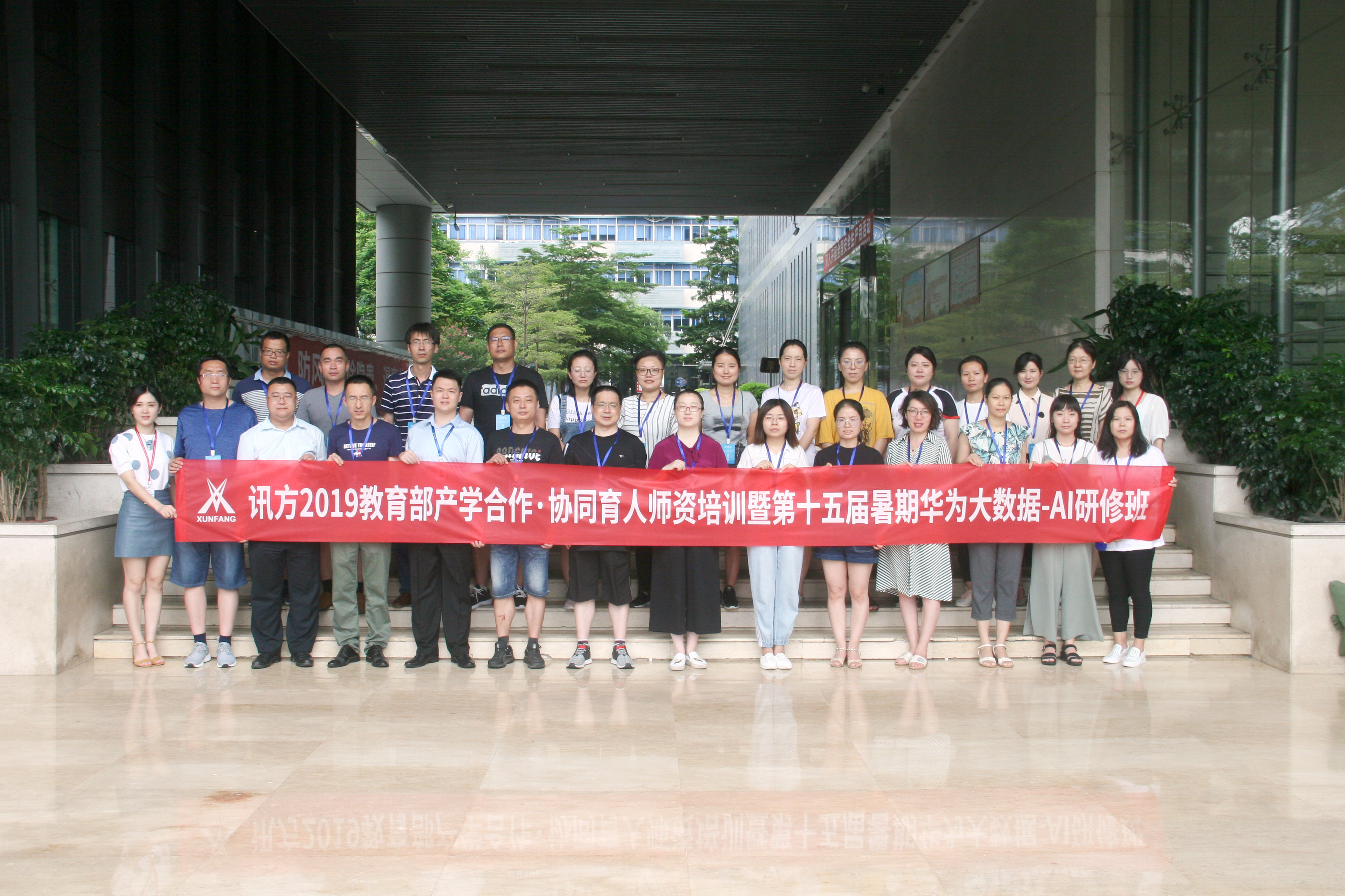 2019年7月22日上午,由讯方公司主办的“讯方2019教育部产学合作·协同育人师资培训暨第十五届暑期华为大数据-AI研修班”开班仪式在智汇云校举行,华南区总经理王沛嵩、智汇云校资深讲师张润泽、潘梁以及铜仁学院、深圳信息技术职业学院、太原工业学院、河北政法职业学院、安徽理工大学、杨凌职业技术学院、河西学院、豫章师范学院、柳州铁道职业技术学院、青海交通职业技术学院等24名老师参加开班仪式。