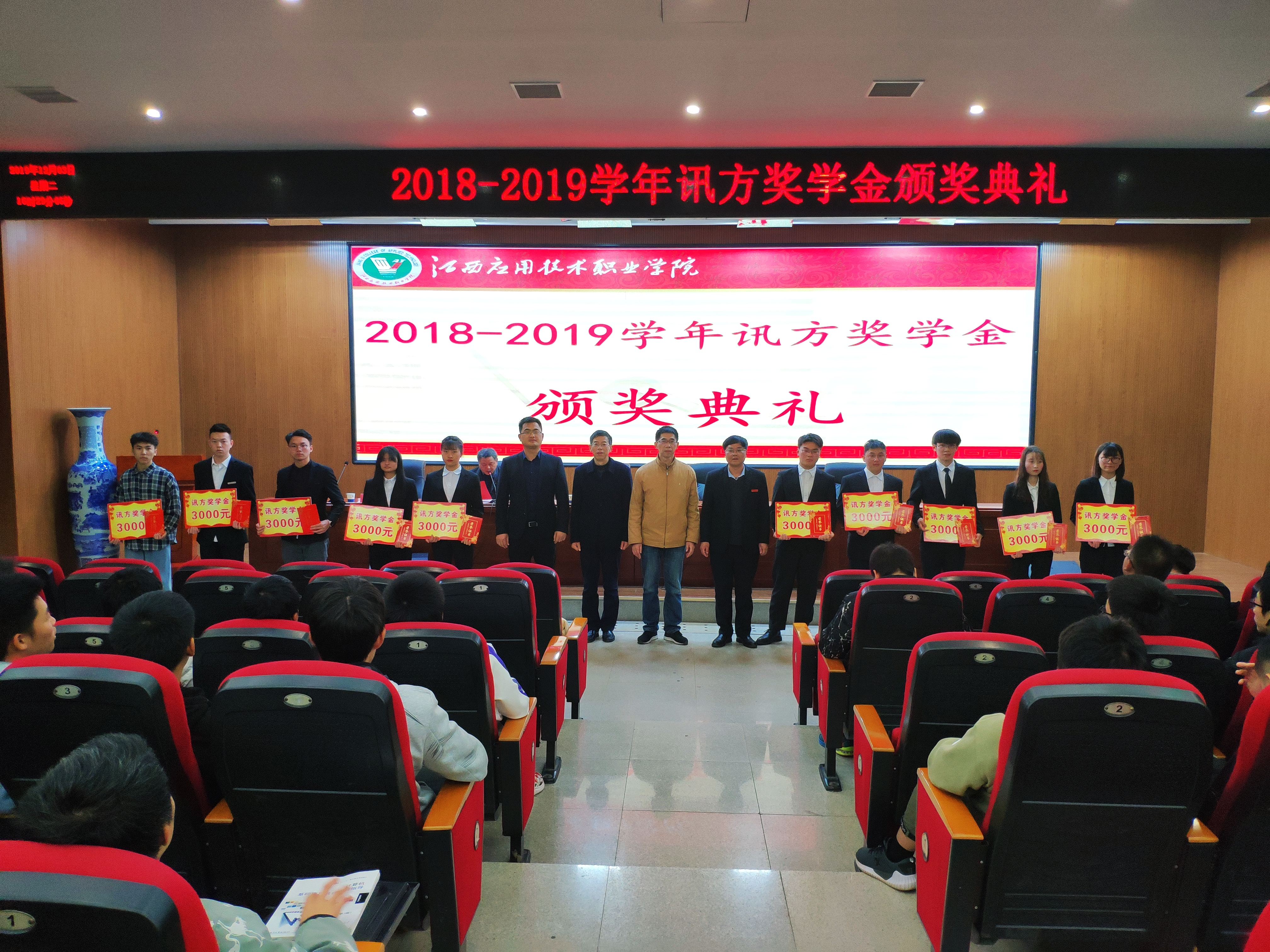 2019年12月3日下午,企业奖学金——讯方奖学金颁奖典礼在江西应用技术职业学院学术报告厅举行,参加颁奖典礼的人员有:校企合作处处长方志宏、信息工程学院书记贺小熊、院长陈友福、副院长李中堂,我司华中校企合作部总监邹志勇、江西区域总监王尚奎以及信息学院老师、我司工作人员和讯方技术学院部分学生。