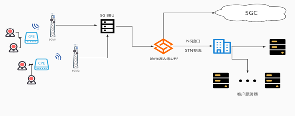 考虑到客户对视频传输清晰度、流畅度以及监控数据的安全性和保密性要求较高,故本项目采用“比邻”的模式,监控视频数据通过切片传输到位于珠海电信机房的边缘UPF上,再通过STN专线安全推送到客户的服务器上。而现场安装时新增一台室外型CPE,卡签入该项目专用DNN,并给每张卡配置固定IP,方便后期监控维护。CPE通过网线与智能摄像头连接,如同一个监控点位有多个摄像头,可在CPE与摄像头间新增一台工业级微型交换机,实现一个CPE带多个摄像头。